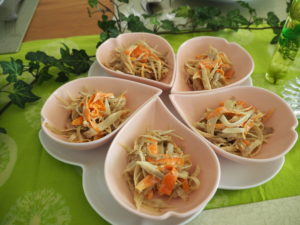 今回のテーマは、「春野菜で健康に♪海老入りロールキャベツ、新ごぼう天と新ごぼうサラダ」でした。
