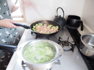 今回のテーマは、「きゅうりで夏バテ予防♪翡翠ソースで蒸し鶏とスープ、海老と卵炒め」でした。