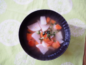大根と人参は副菜としてもピッタリです。茹で汁にトマトを加えて、さっぱりとした味わいスープに仕上げます。